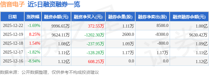 证券之星消息,截至2025年12月22日收盘,信音电子(301329)报收于23.87元,下跌1.69%,换手率16.69%,成交量10.0万手,成交额2.4亿元。