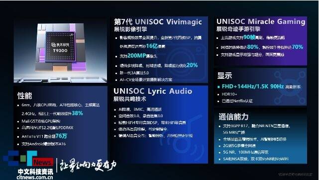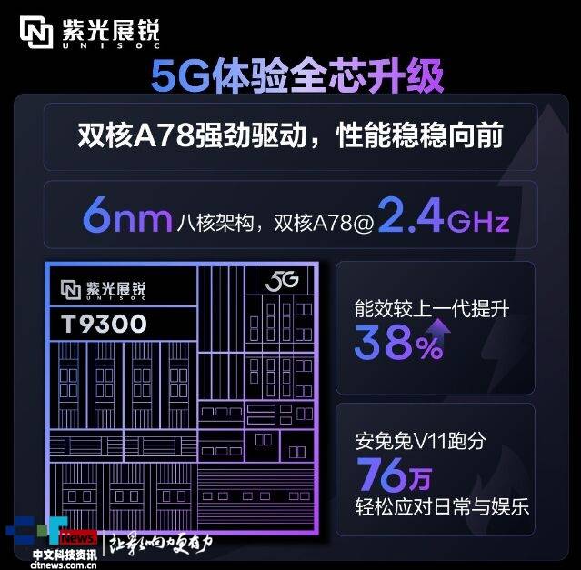 近日,紫光展锐正式发布影音游戏体验进阶的高性能5G SoC芯片——T9300,该平台支持5G双卡双待、最新Android 16。搭载第7代Vivimagic影像引擎,支持2亿像素;同时搭载UNISOC Miracle® Gaming奇迹手游引擎,安兔兔V11跑分达76万;融合5G NR NTN卫星通信及5G MBS广播功能,为全球主流用户带来更出色的5G体验。