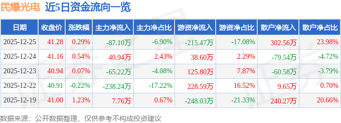 证券之星消息,截至2025年12月25日收盘,民爆光电(301362)报收于41.28元,上涨0.29%,换手率1.03%,成交量3055.0手,成交额1261.48万元。