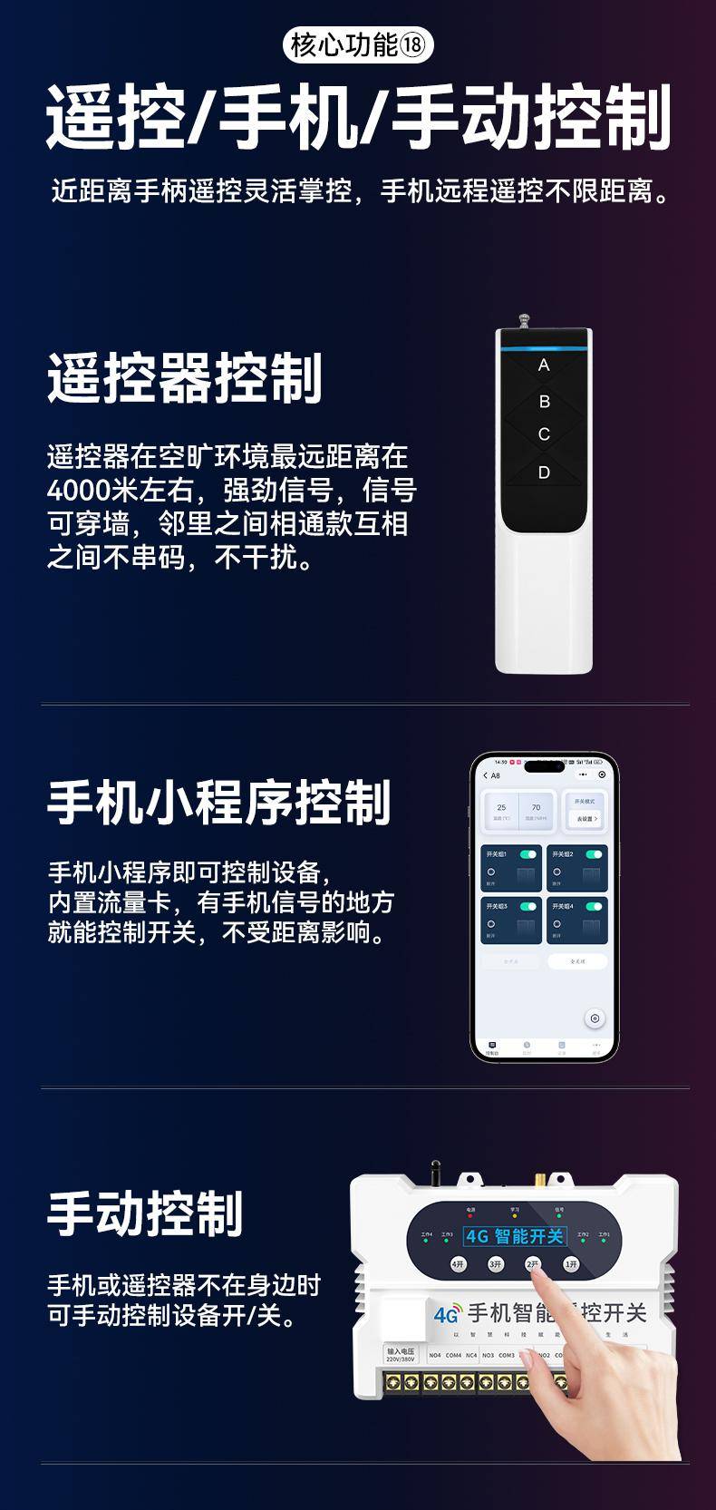 公司主营业务丰富多样,涵盖了众多类型的智能开关产品。**4g远程控制开关**作为公司的核心产品之一,具备强大的远程控制功能,用户只需通过手机APP,无论身处何地,都能轻松实现对开关的远程操控,极大地方便了日常生活和工作。**4g远程智能开关**则在远程控制的基础上,融入了更多的智能化元素,如定时开关、场景模式设置等,让用户可以根据自己的需求,灵活定制开关的使用方式,进一步提升生活的智能化水平。**4G远程启动停止控制增氧机开关**是专门为水产养殖行业设计的智能开关产品,它能够精准控制增氧机的启动和停止,为水产养殖提供稳定的氧气供应,有效提高养殖效率,保障养殖生物的健康成长。**4g远程遥控开关**和**遥控开关**则以其便捷的操作方式,满足了用户在不同场景下的使用需求,无论是家庭中的灯光控制,还是工业设备的管理,都能轻松应对。**智能开关**作为公司的主打产品,集多种功能于一体,具备高精度、高稳定性等特点,为用户提供了更加智能、便捷的开关解决方案。**手机遥控开关**和**手机远程遥控开关**充分利用了手机的便捷性,让用户可以通过手机随时随地控制开关,真正实现了开关的智能化管理。**远程控制开关**和**无线遥控开关**则打破了传统开关的有线束缚,采用无线通信技术,实现了开关的远程无线控制,为用户带来了更加自由、灵活的使用体验。**水泵开关控制器**、**4G水泵开关控制器**以及**4G水泵遥控开关**和**水泵遥控开关**等产品,针对水泵的控制需求进行了专门设计,具备精准的控制能力和可靠的稳定性,广泛应用于农业灌溉、工业用水等领域,为水泵的高效运行提供了有力保障。