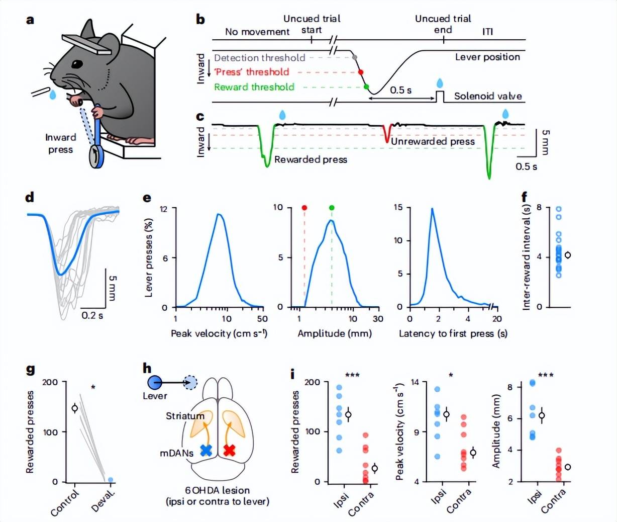 在实验中,研究团队让小鼠用左前肢自主按压杠杆来获取奖励,并对小鼠按压杠杆时的大脑多巴胺水平变化进行监测,从而对多巴胺和运动活力之间的具体关系进行分析。