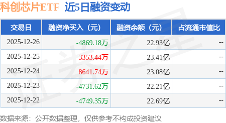 证券之星消息,12月26日,科创芯片ETF(588200)融资买入1.84亿元,融资偿还2.33亿元,融资净卖出4869.18万元,融资余额22.93亿元,近20个交易日中有11个交易日出现融资净买入。