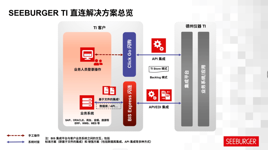 自 TI 在中国启动 TI API 直连业务以来,其技术实现基于 SEEBURGER 在 API/EDI 数据集成方面提供的成熟的解决方案。围绕 TI API 对接,SEEBURGER 提供了从集成流程咨询、业务模式与场景咨询、内部系统集成优化,到接口开发与版本更新、项目管理等一站式支持。基于此,进一步形成了采购增强系统 SEEBURGER Click Go 闪购:以 Web Portal 的形式把 TI API 直连能力封装成可直接使用的统一入口,强调“即插即用、低代码、易用”,并配套报表导出、主动监控、邮件提醒等能力。