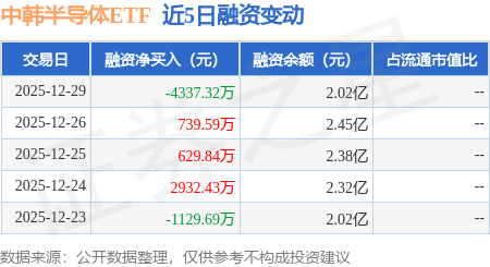 证券之星消息,12月29日,中韩半导体ETF(513310)融资买入2.09亿元,融资偿还2.52亿元,融资净卖出4337.32万元,融资余额2.02亿元,近20个交易日中有12个交易日出现融资净买入。