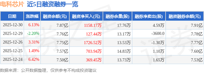 电科芯片融资融券信息显示,融资方面,当日融资买入1.6亿元,融资偿还1.48亿元,融资净买入1158.17万元,连续3日净买入累计3012.14万元。融券方面,融券卖出5.13万股,融券偿还5400.0股,融券余量17.76万股,融券余额310.62万元。融资融券余额7.91亿元。