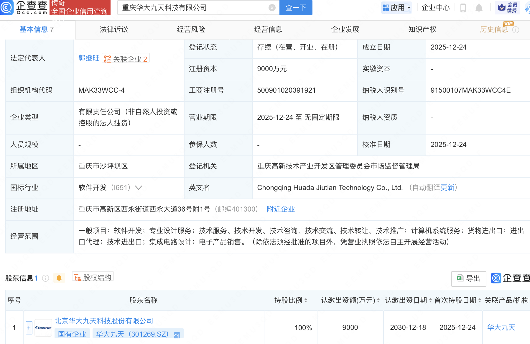 企查查APP显示,近日,重庆华大九天科技有限公司成立,注册资本9000万元,经营范围包含:软件开发;专业设计服务;集成电路设计;电子产品销售等。企查查股权穿透显示,该公司由华大九天(301269)全资持股。