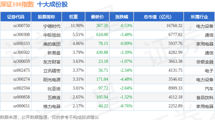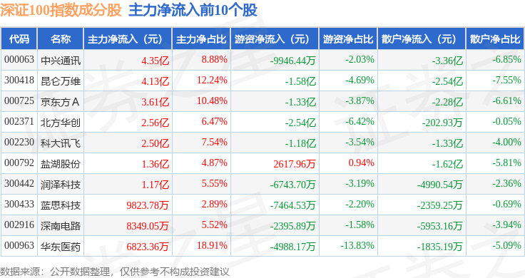 资金流向方面,深证100(399330)指数成份股当日主力资金净流出合计119.6亿元,游资资金净流入合计46.39亿元,散户资金净流入合计73.21亿元。成份股资金流向详情见下表: