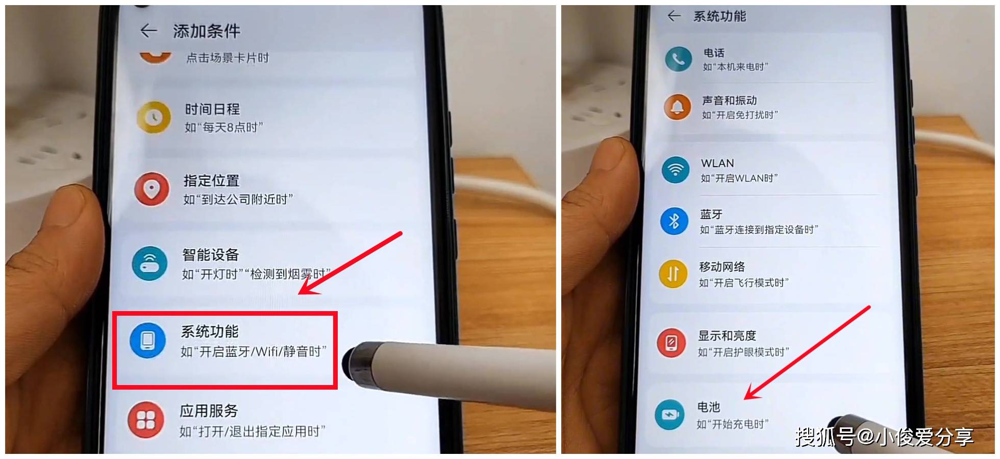 接下来,我们选择添加的条件,这边,我们先点一下【系统功能】,然后找到【电池】这一项,大家记住了,千万不要选错了,好选好之后啊,咱们把它打开哈!