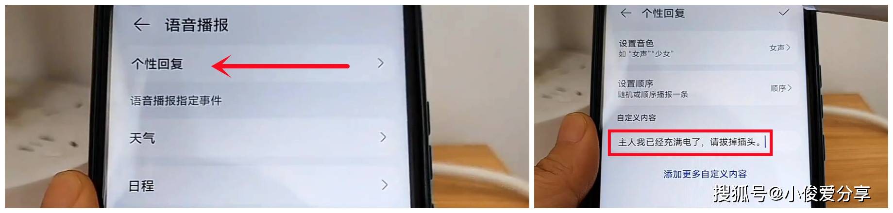接下来,我们可以选择语音播报了,大家看到没有?我们把它点一下,找到语音播报,我们把它打开,点个性回复,选择自定义内容,我们把它点一下啊,然后在这里面,我们输入想让手机提醒我们的话,比如说:“主人,我已经充满电了,请拔掉插头了”。