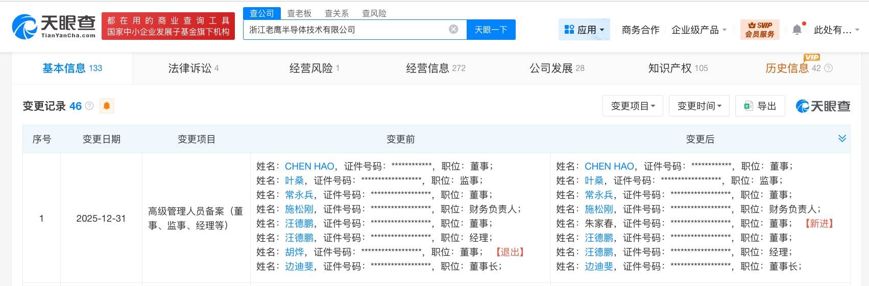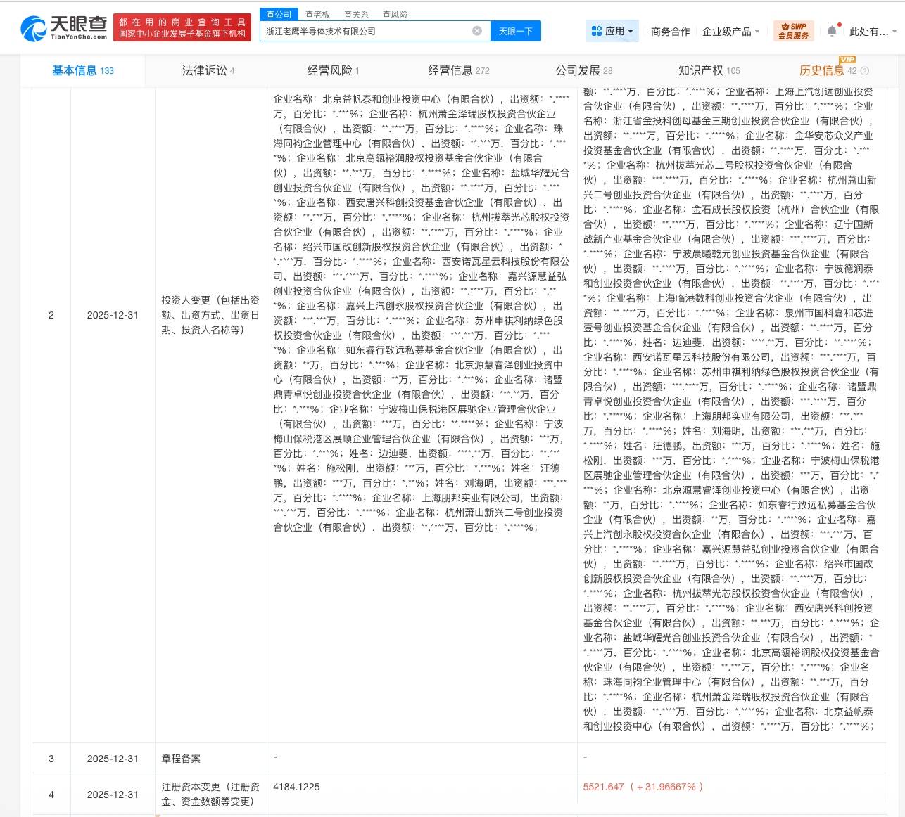 雷达财经讯,天眼查工商信息显示,近日,浙江老鹰半导体技术有限公司发生工商变更,新增茅台金石(贵州)产业发展基金合伙企业(有限合伙)、上海上汽创远创业投资合伙企业(有限合伙)、深创投中小企业发展基金(苏州)合伙企业(有限合伙)等为股东,注册资本由约4184万人民币增至约5522万人民币,同时,部分高管也发生变更。