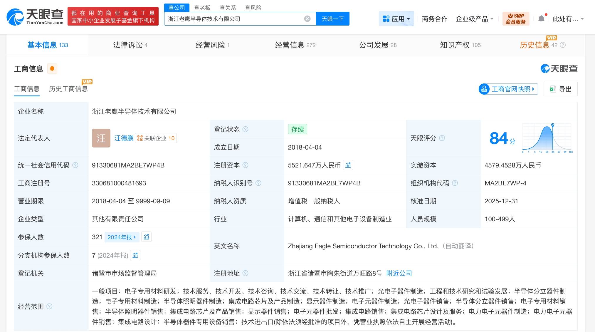 浙江老鹰半导体技术有限公司成立于2018年4月,法定代表人为汪德鹏,经营范围含电子专用材料研发、工程和技术研究和试验发展、半导体分立器件制造、电子专用材料制造、集成电路芯片及产品制造、显示器件制造、集成电路销售、集成电路芯片设计及服务等。股东信息显示,该公司现由边迪斐、宁波梅山保税港区展驰企业管理合伙企业(有限合伙)、西安诺瓦星云科技股份有限公司及上述新增股东等共同持股。