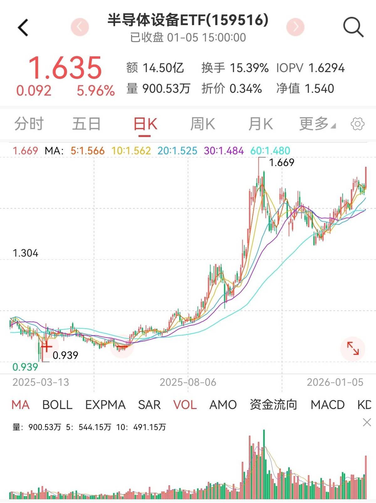 半导体设备ETF(159516)1月5日上涨5.96%。