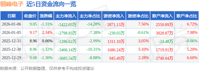 证券之星消息,截至2026年1月6日收盘,铜峰电子(600237)报收于9.05元,下跌1.31%,换手率6.74%,成交量41.89万手,成交额3.8亿元。