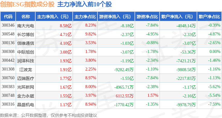 资金流向方面,创指ESG(970028)指数成份股当日主力资金净流出合计66.51亿元,游资资金净流入合计6.65亿元,散户资金净流入合计59.86亿元。成份股资金流向详情见下表: