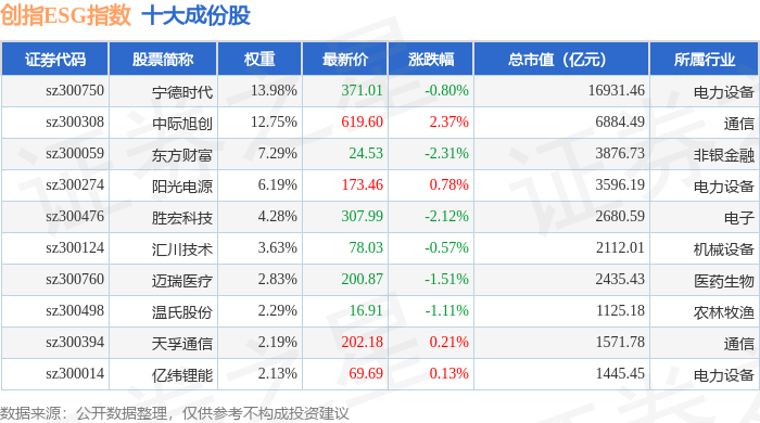 创指ESG(970028)指数十大成份股详情如下: