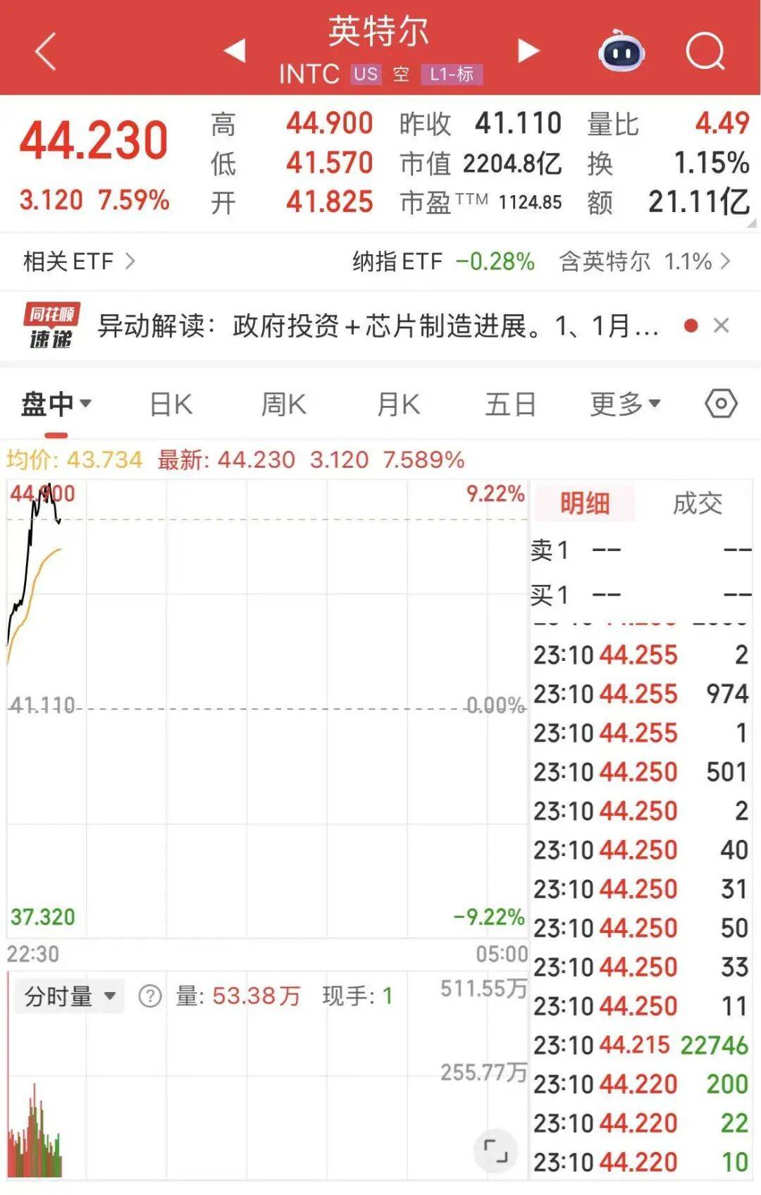 美股芯片股普涨,阿斯麦涨超5%,应用材料涨超4%,博通、美光科技涨超3%。英特尔盘中涨幅一度扩大至9%,股价创2024年4月以来盘中新高。截至发稿,涨超7%,报44.23美元/股。