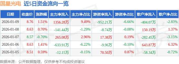 1月9日的资金流向数据方面,主力资金净流入1356.28万元,占总成交额9.49%,游资资金净流出952.21万元,占总成交额6.66%,散户资金净流出404.07万元,占总成交额2.83%。