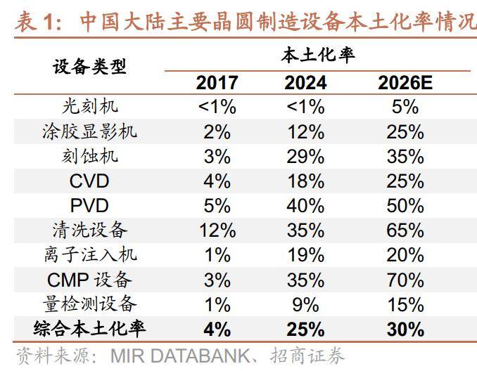 根据MIR,2024年中国晶圆制造设备综合本土化率25%,其中光刻机、量检测设备、涂胶显影机的国产化率较低,分别为<1%、9%、12%;MIR预测到2026年,中国晶圆制造设备综合本土化率有望提升至30%。
