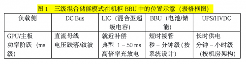 传统BBU多以电池为核心储能。面对毫秒级功率缺口,电池受限于化学反应动力学与等效内阻,响应往往不如电容类储能敏捷。因此,机柜侧开始采用“LIC(瞬态)+BBU(短时)+UPS/HVDC(长时)”的分级策略: