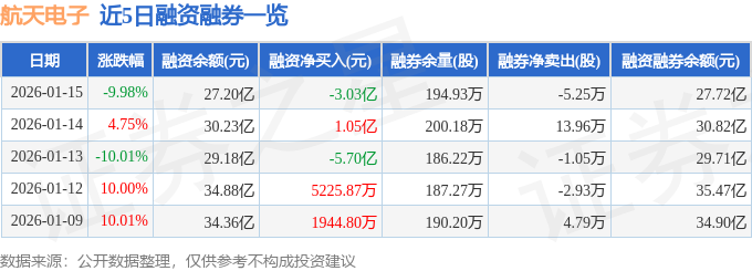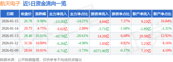 证券之星消息,截至2026年1月15日收盘,航天电子(600879)报收于26.78元,下跌9.98%,跌停,换手率6.12%,成交量202.03万手,成交额54.77亿元。