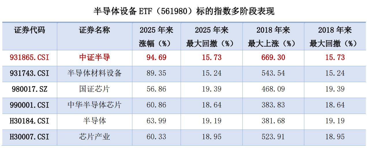 它的标的指数在同类中是弹性最强的——2025年至今涨幅94.69%、上一轮半导体周期(2018年)至今最大涨幅近670%,均在同类指数中位居第一。
