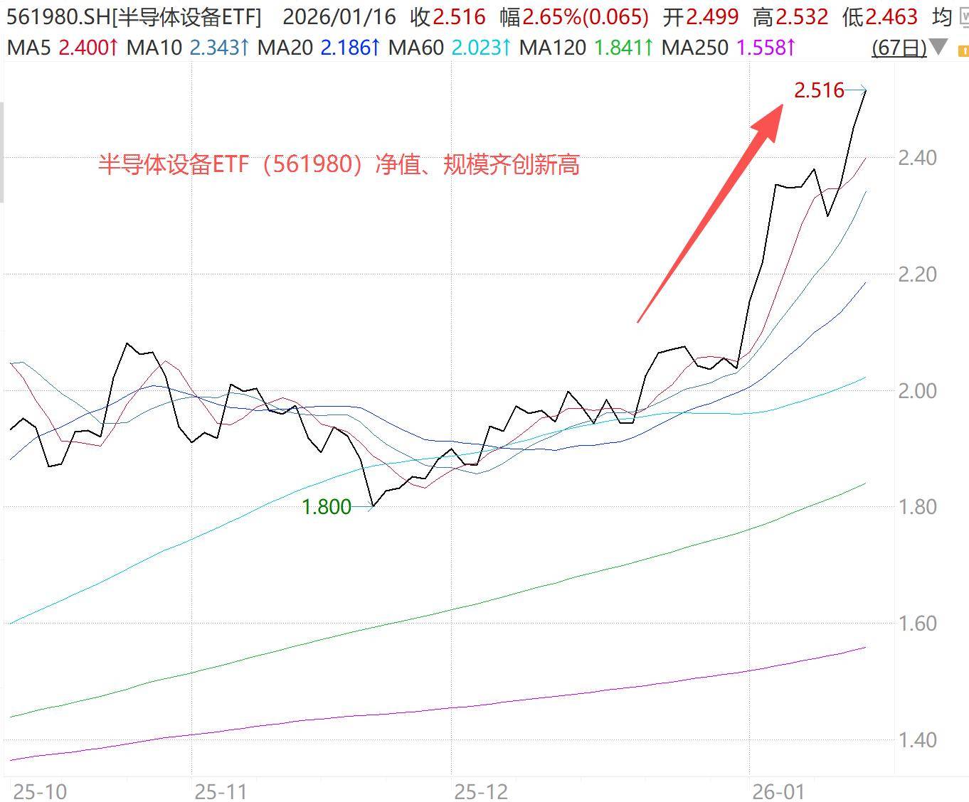 市场反应迅疾而热烈。半导体设备ETF(561980) 应声大涨,净值与规模齐创新高,几大权重股中微公司、北方华创、长川科技全部新高。在这场AI驱动存储超级周期与国产替代的双重史诗叙事中,最确定的赢家无疑是卖铲子的。