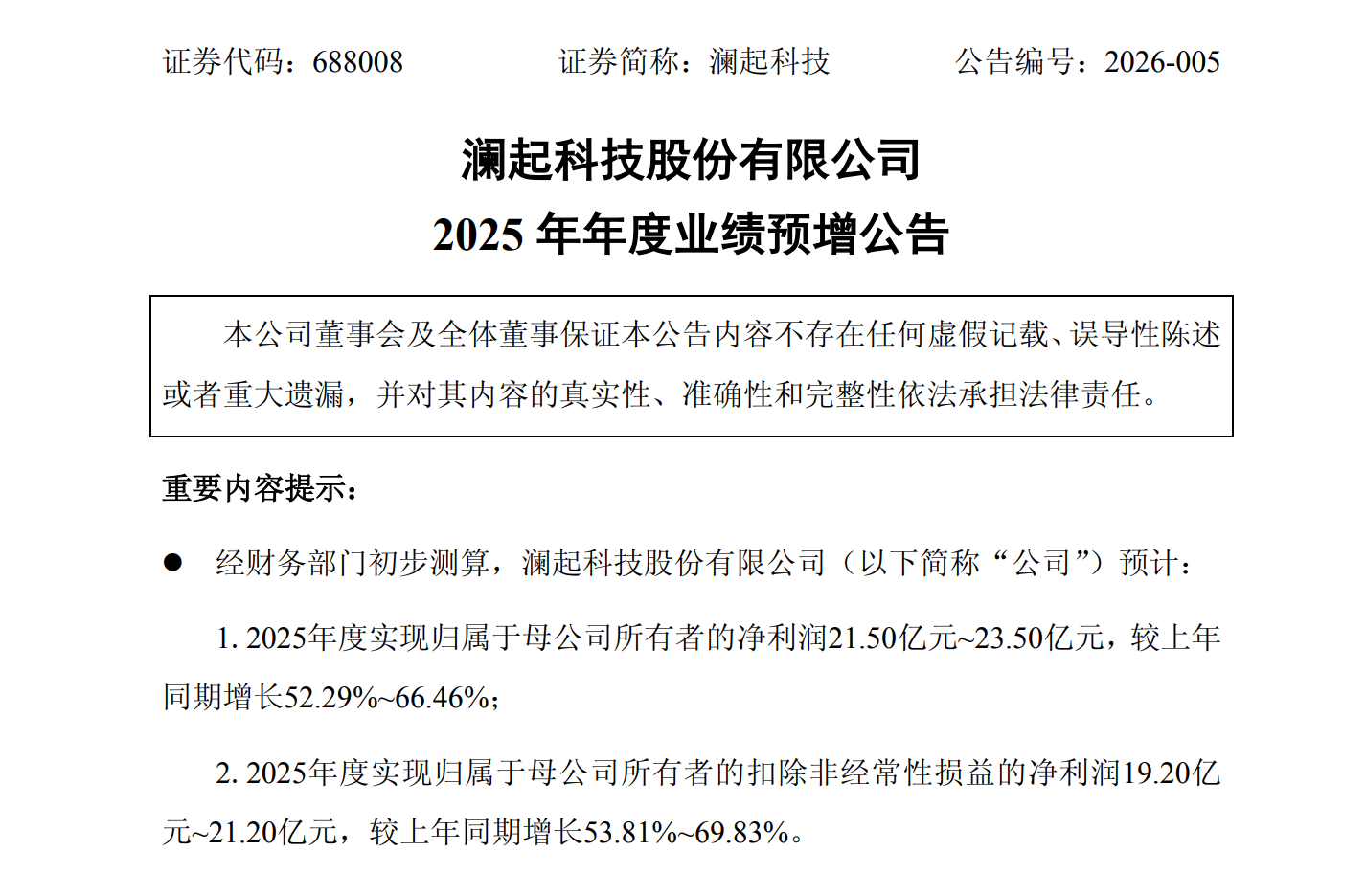1月16日晚间,澜起科技股份有限公司(澜起科技,688008.SH)发布业绩预增公告, 经财务部门初步测算,公司预计2025年度实现归属于母公司所有者的净利润21.50亿元-23.50亿元,较上年同期增长52.29%-66.46%;2025年度实现归属于母公司所有者的扣除非经常性损益的净利润19.20亿元-21.20亿元,较上年同期增长53.81%-69.83%。