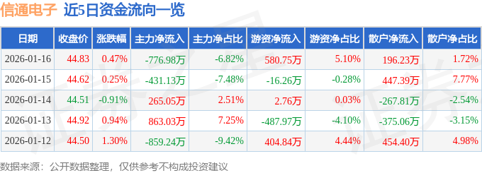 证券之星消息,截至2026年1月16日收盘,信通电子(001388)报收于44.83元,上涨0.47%,换手率8.04%,成交量2.51万手,成交额1.14亿元。