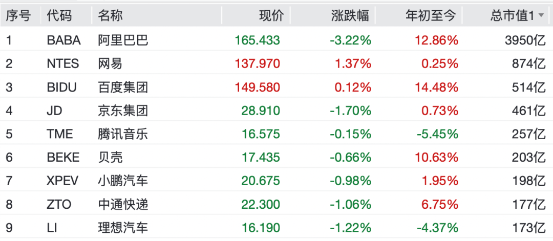 中概股多数下跌,纳斯达克中国金龙指数跌1.15%。热门中概股方面,阿里巴巴跌超3%,京东集团、中通快递、理想汽车、百胜中国跌逾1%,网易、百度集团、华住集团纷纷上涨。