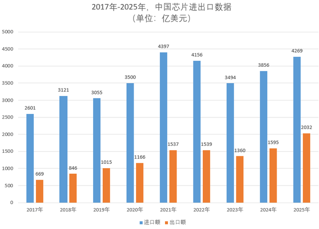 但进口方面,2024年,中国进口芯片的平均价格是5.0元,而2025年进口芯片5916.9亿个,金额为30335.4亿元,平均价格为5.13元,提高了2.6%。