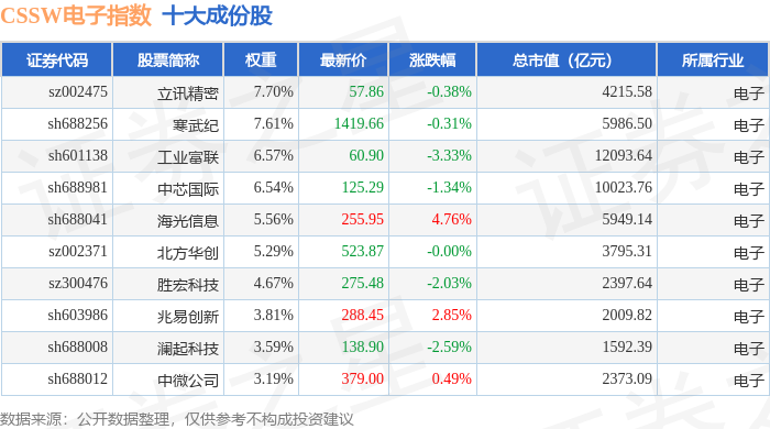 CSSW电子(399811)指数十大成份股详情如下:
