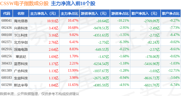 资金流向方面,CSSW电子(399811)指数成份股当日主力资金净流出合计52.34亿元,游资资金净流入合计6.45亿元,散户资金净流入合计45.89亿元。成份股资金流向详情见下表: