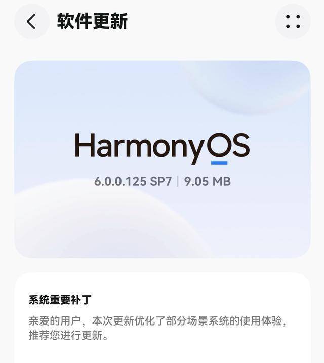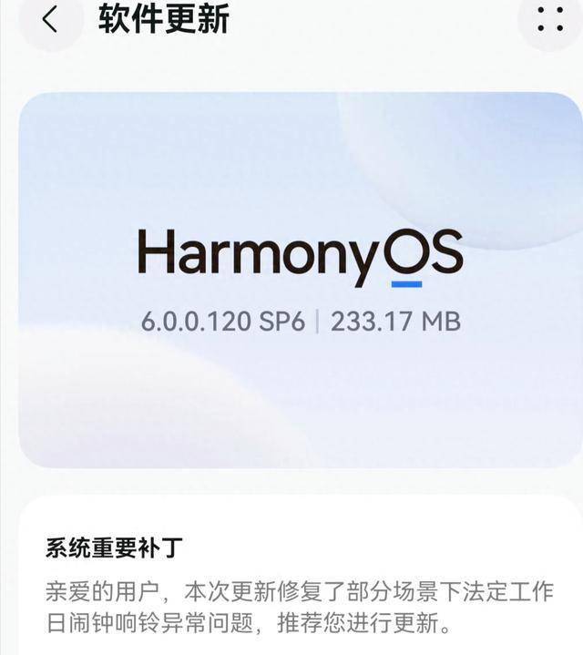 目前推送的是HarmonyOS 6.0.0.120的系统补丁,不是新功能发布,而是明显偏向底层体验的修修补补。