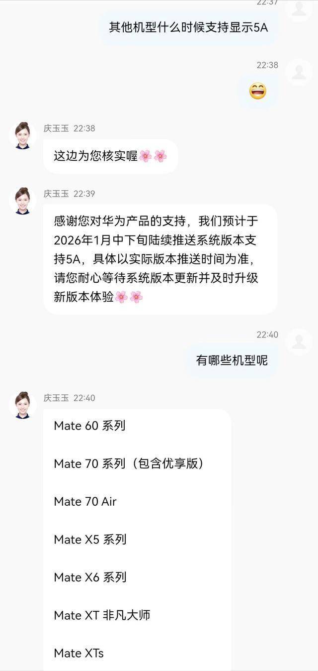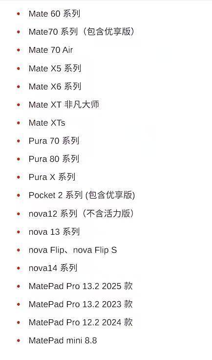 按照官方客服给出的时间表,2026年1月中旬开始,Mate60、70全系,X5、X6,以及Pura和nova大量老机型都会覆盖。