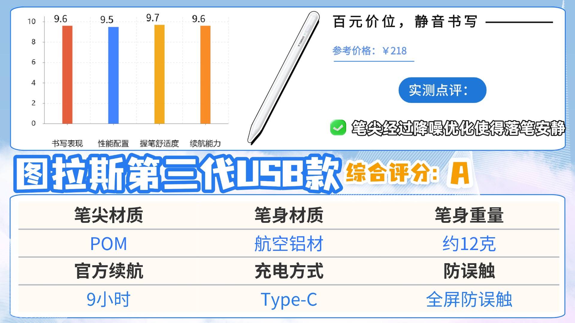 书写体验是电容笔的灵魂,光看宣传没用,重点看实际配置。其中笔尖会直接影响书写质感和屏幕安全,建议首选POM材质笔尖。这种材质硬度适中,书写阻尼感接近真实纸笔,不打滑也不会刮伤屏幕,耐磨度还高,长时间使用也不易变形。同时笔身设计也很关键,重量控制在11-15克之间更舒适,如果可以再搭配人体工学曲线和防滑材质,长时间握笔也不累手。