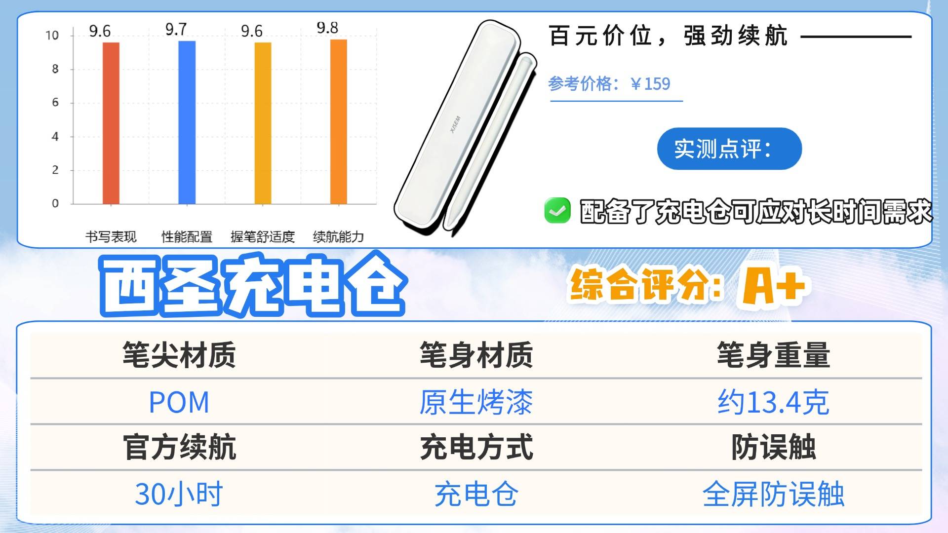 想在百元价位淘一支握感舒服、书写丝滑还续航抗打的 iPad 电容笔平替,那西圣这款带充电仓的型号绝对是闭眼入的优选。握感这块它真的下足了功夫,原生烤漆工艺带来细腻亲肤的触感,拿在手里完全没有廉价塑料的涩感。而且仅13.4克的重量,再加上贴合手掌曲线的人体工学设计,握持时贴合度超高,不管是连续几节课记笔记,还是对着平板画一下午草图,手腕都不会有明显的酸胀感。