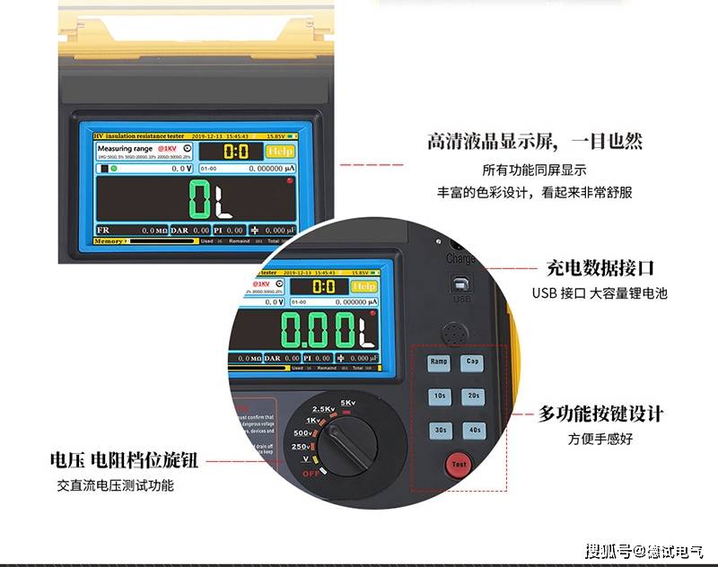 采用真彩触摸屏搭配旋钮开关与按键组合,所有测试数据、电池电量同屏清晰显示,无需反复切换界面即可掌握核心信息。内置智能辅助功能,点击屏幕“HELP”键即可弹出详细操作指引,无需记忆复杂操作流程,大幅降低培训成本。同时,仪器配备测试计时器,可自动记录测试时长,同步存储含日期时间戳的测试结果,通过触摸屏可便捷查阅历史数据;搭配完全隔离的USB接口,能将数据安全上传至PC机,便于数据归档、分析与报告生成,契合现代化运维管理需求。