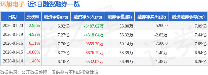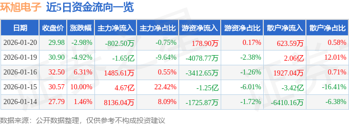 证券之星消息,截至2026年1月20日收盘,环旭电子(601231)报收于29.98元,下跌2.98%,换手率1.55%,成交量35.38万手,成交额10.69亿元。
