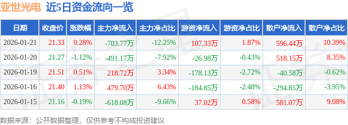 证券之星消息,截至2026年1月21日收盘,亚世光电(002952)报收于21.33元,上涨0.28%,换手率2.05%,成交量2.7万手,成交额5742.95万元。