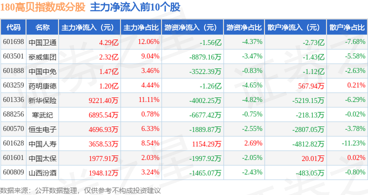 资金流向方面,180高贝(000135)指数成份股当日主力资金净流出合计22.57亿元,游资资金净流入合计4.96亿元,散户资金净流入合计17.6亿元。成份股资金流向详情见下表: