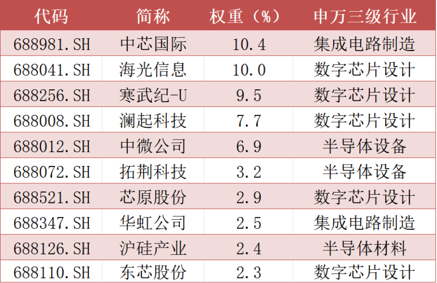指数成分股具有较高的“硬科技”属性,前十大权重股合计占比近58%,覆盖了多只设计、制造、材料和设备领域龙头股。