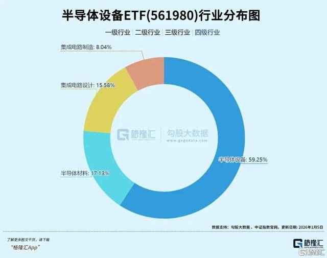 该ETF跟踪的中证半导,精准卡位半导体产业链上游高价值、高弹性的 "卖铲子" 环节,标的指数中“设备”含量近60%,半导体设备+数字芯片设计+材料三行业占比超90%。