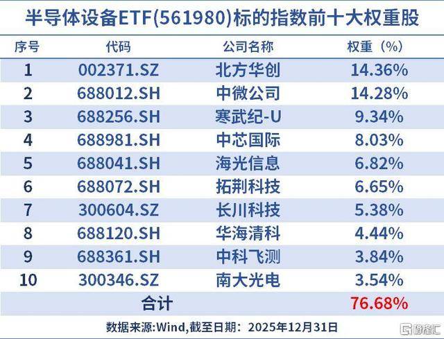 该指数的龙头效应显著,前十大权重股集中度76.68%,集中度居同类指数第一,重点布局如中微公司(刻蚀设备)、北方华创(多领域设备)、中芯国际(制造龙头)、寒武纪(AI 芯片设计)等,设备环节技术壁垒高,龙头企业在政策支持下业绩爆发力强,因此指数弹性更高。