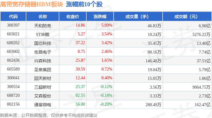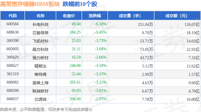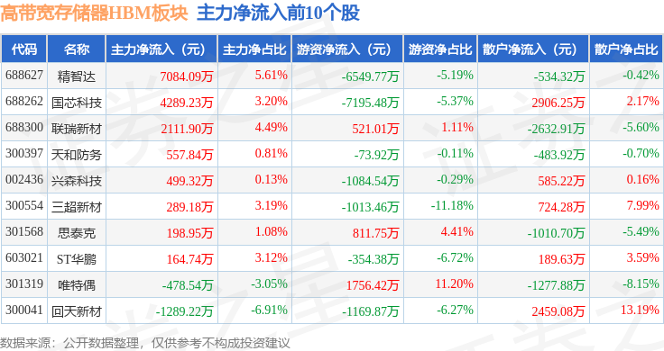 从资金流向上来看,当日高带宽存储器HBM板块主力资金净流出62.74亿元,游资资金净流入24.63亿元,散户资金净流入38.11亿元。高带宽存储器HBM板块个股资金流向见下表: