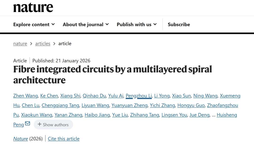 1月22日,据复旦大学官微,复旦大学纤维电子材料与器件研究院、高分子科学系、先进材料实验室、聚合物分子工程全国重点实验室彭慧胜、陈培宁团队突破传统芯片硅基研究范式,近日率先提出并制备“纤维芯片”,相关成果以《基于多层旋叠架构的纤维集成电路》为题于北京时间1月22日凌晨发表于国际期刊《自然》(Nature)。