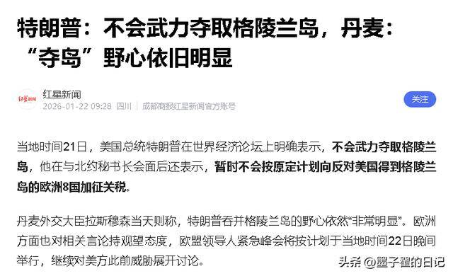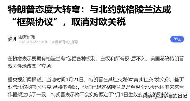 1月21日,特朗普直接在社交媒体官宣和北约达成框架协议,不仅放弃动武,还彻底取消了原定2月1日生效的关税。