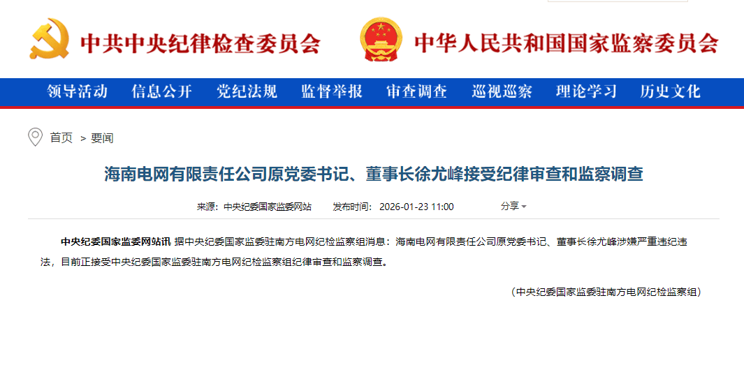 据中央纪委国家监委驻南方电网纪检监察组消息:海南电网有限责任公司原党委书记、董事长徐尤峰涉嫌严重违纪违法,目前正接受中央纪委国家监委驻南方电网纪检监察组纪律审查和监察调查。