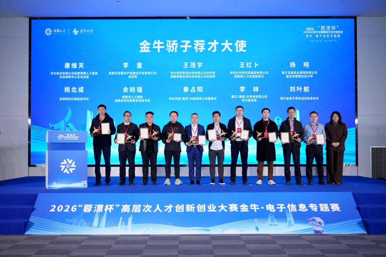 为进一步拓宽引才渠道,畅通人才与金牛的沟通桥梁,金牛区特别设立“金牛骄子荐才大使”,邀请各行各业的优秀代表,担任金牛引才的“代言人”和“牵线人”。活动现场,10名来自华为、中科光智、蜀芯半导体等院所企业、行业商协会的人才被授予“金牛骄子荐才大使”荣誉。他们未来将依托所在平台资源与行业影响力,以责任为媒、以信任为桥,积极宣传金牛、引荐英才,为金牛加快打造现代都市产业人才高地注入强劲动力。