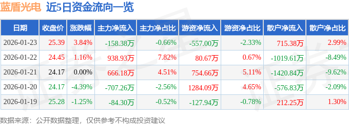 证券之星消息,截至2026年1月23日收盘,蓝盾光电(300862)报收于25.39元,上涨3.84%,换手率6.32%,成交量9.57万手,成交额2.39亿元。