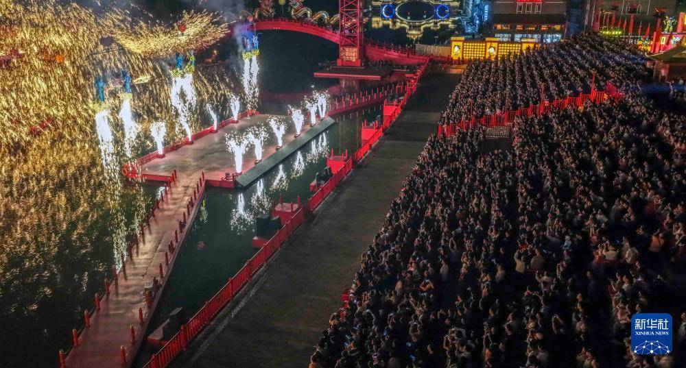 2025年10月7日晚,游客在河北省唐山市丰南区河头老街景区观看演出(无人机照片)。新华社发(刘满仓摄)